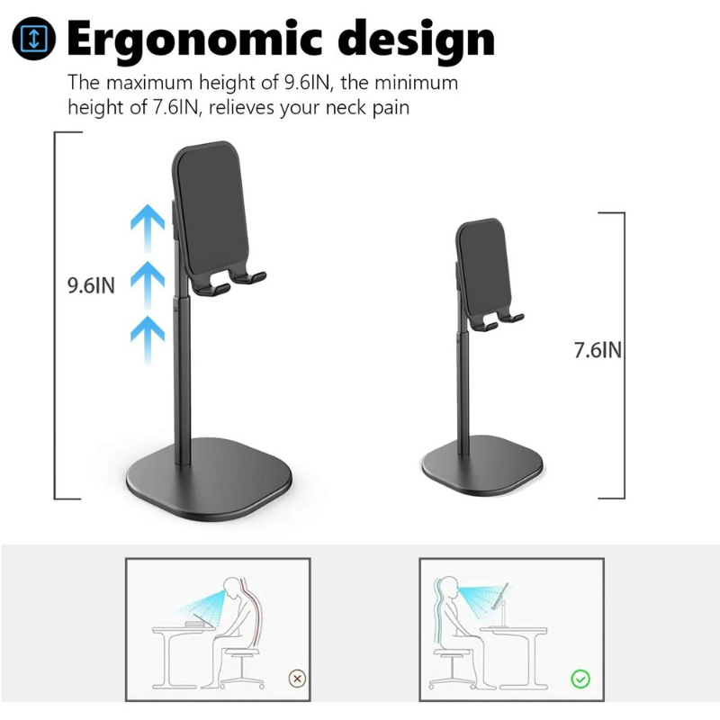 Height & Angle Adjustable This desktop adjustable cell phone stand holder is ergonomic designed, The adjustable height(7.6-9.6Inch ) & angle (4°-45°) could be adjusted to meet your different viewing demands. Features Protection The bottom and upper parts of this mobile phone holder are made of advanced non-slip silicone material Rubber pads and feet of the smartphone desk holder can protect your device from daily scratches and sliding. Quality Material This adjustable mobile phone holder is sturdy and durable, made of aluminium alloy silicone ABS, and the weighted base is stable and does not shake when you use it. The universal Stand is compatible with all mobile phones between 4 and 7.9 inches and devices between 4 and 10 inches. Thoughtful Design There’s even a cut-out at the bottom of the holder so that you can charge your phone while it’s on the stand, a very convenient and thoughtful design.