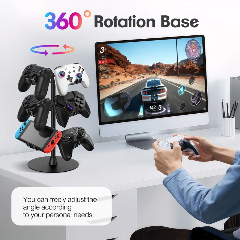 With 9 stowable positions, the swivel stand perfectly organizes and displays your controllers.