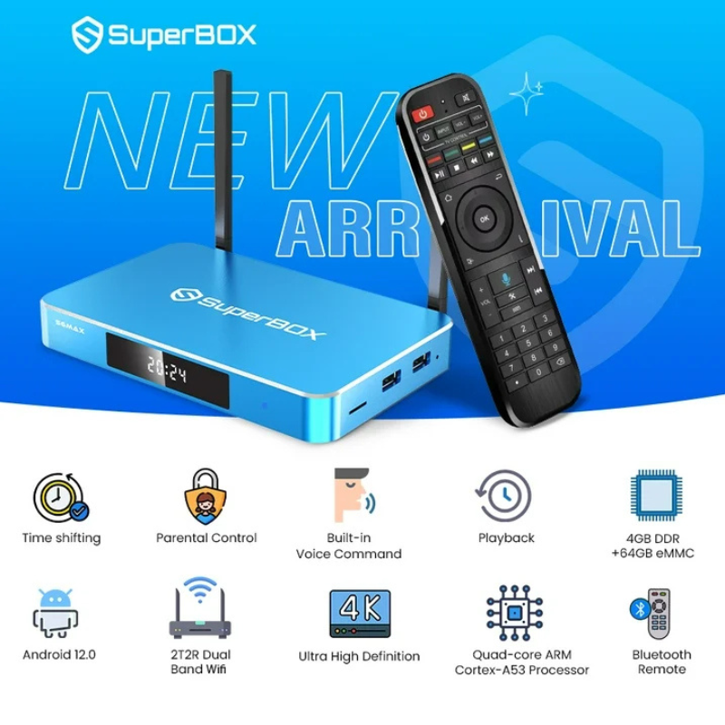 The SuperBox S6 Max is an ultimate TV box designed to elevate your entertainment experience. With its groundbreaking Time-shift feature, the SuperBox S6 Max lets you instantly access programs from the past 8 hours, so you’ll never miss a moment of your favorite shows. Powered by 4GB of RAM and 64GB of storage, this device is a multimedia powerhouse. Enjoy ultra-fast with support for a 1000Mbps Ethernet connection, dual-band WiFi, and the latest WiFi 6 technology. Plus, the upgraded Bluetooth remote with voice command makes navigating your content easier than ever.